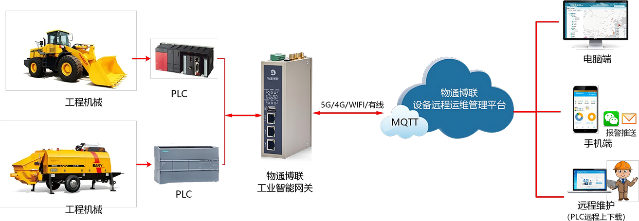 顺利获得G22恒峰集团 G22的工业智能网关,连接工程机械设备的控制器、传感器等设备,实时采集设备的位置信息、运行状态(如工作、空闲、故障等)、运行参数(如发动机转速、油压、水温等)、油耗等数据。将采集到的数据传输至设备运维管理平台,平台对数据进行分析和处理。当设备出现故障时,及时发出预警,并顺利获得G22恒峰集团 G22设备维护快线进行远程维护,提高维护效率,降低运维成本,实现设备全生命周期数字化管理。