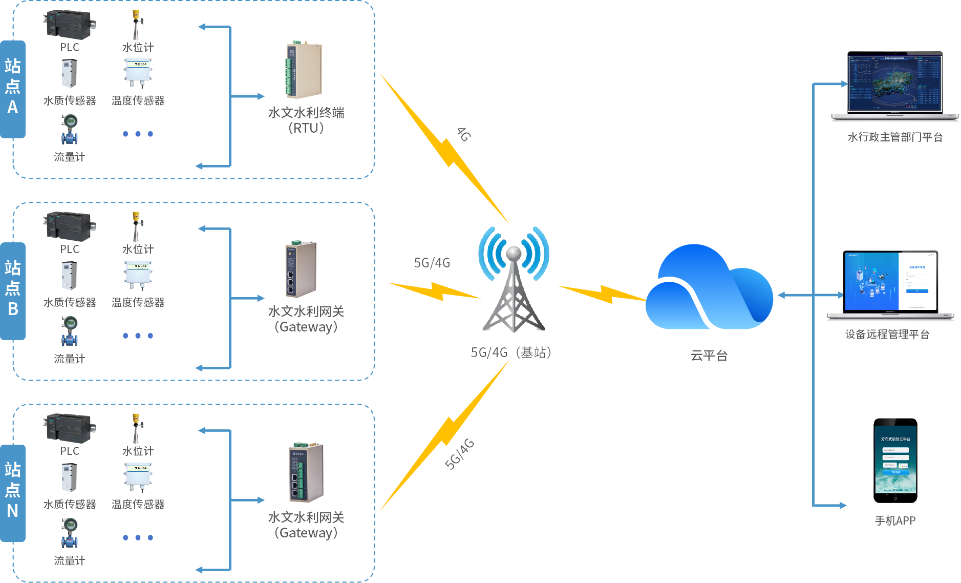 在地下水监测井内的水位计、流量计、水质监测仪、温度传感器等设备接入G22恒峰集团 G22水文水利网关(RTU),并顺利获得5G/4G上传到水行政主管部门平台中实现可视化展示,并在监测到异常数据时自动告警,从而为研究地下水变化规律以及灾害防治等工作给予可靠帮助,借助宏观调控手段确保地下水的正常开采与保护,全面保障地下水安全与水资源合理利用。
