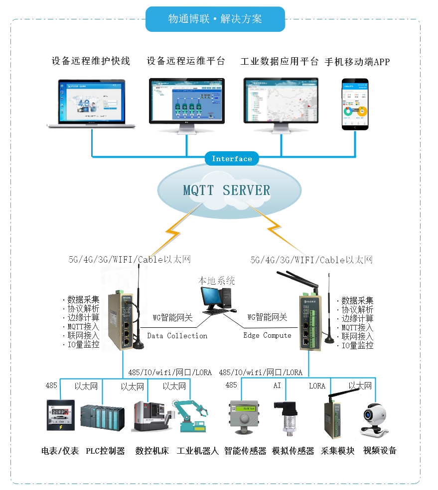 支持5G、4G、WIFI、有线以太网、光纤、LORA等联网接入方式。