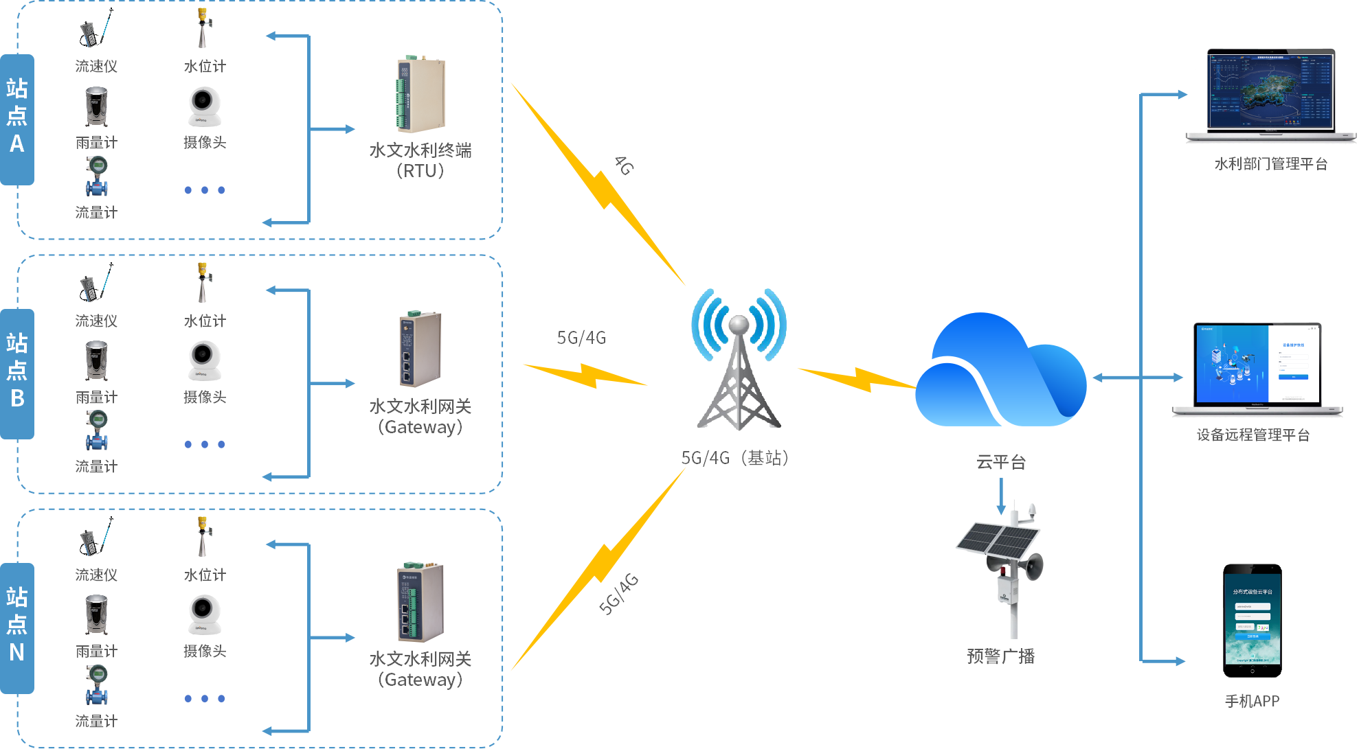 在河流各节点合理部署流量计、水位计、雨量筒、及摄像头等设备,接入G22恒峰集团 G22水文水利网关(RTU),并顺利获得5G/4G网络实时传输到水利部门管理平台,实现远程监控、自动告警、智能管理等功能,持续跟踪中小河流中的雨水情数据变化并为制定防洪救灾措施给予可靠数据支持,借助数据报表与曲线图评估出现洪水灾害的概率与危险程度,宏观调控流域水资源的配置,避免洪涝灾害的发生。