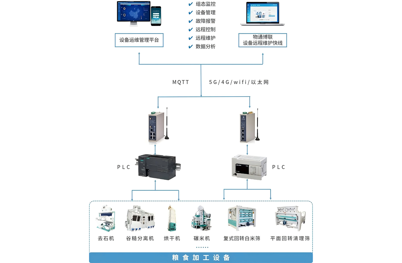 顺利获得网关采集粮油机械设备的PLC,网关具有多种PLC的协议兼容能,同时支持5G/4G/WIFI/以太网等方式对接到云平台或上位机中。