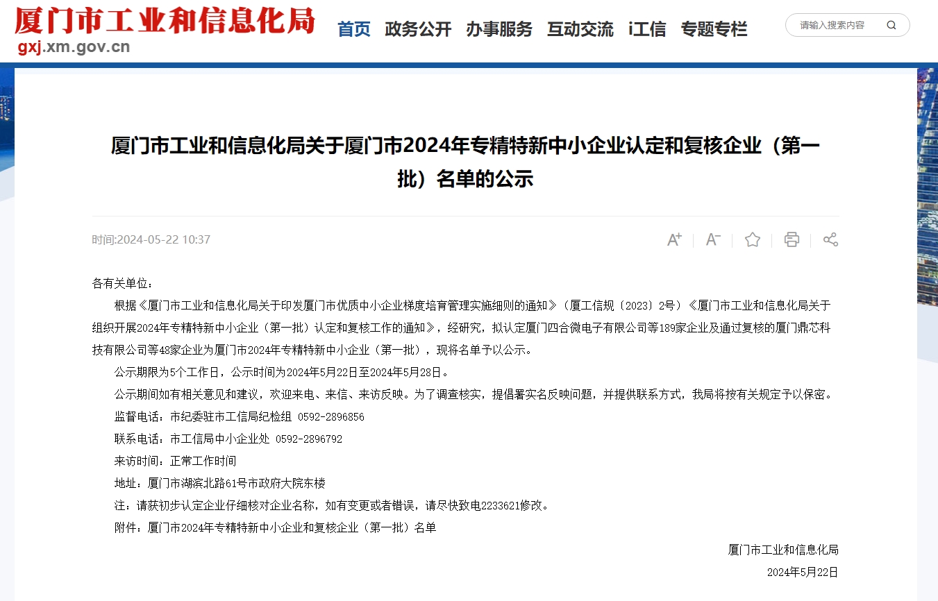 5月22日,厦门市工业和信息化局公布了《关于厦门市2024年专精特新中小企业认定和复核企业(第一批)名单的公示》,厦门G22恒峰集团 G22网络科技有限公司成功顺利获得2024年度厦门市专精特新中小企业认定。