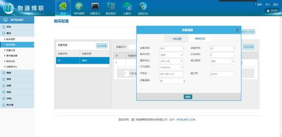 输入设备名称(任意),设备序号(任意,注意同一网关下的设备序号不能重复),从站地址(设备站号),通信协议(OPC UA),IP 地址(设备 IP 地址)以及端口号(设备端口号),采集周期根据自身需求设置,然后点击保存。