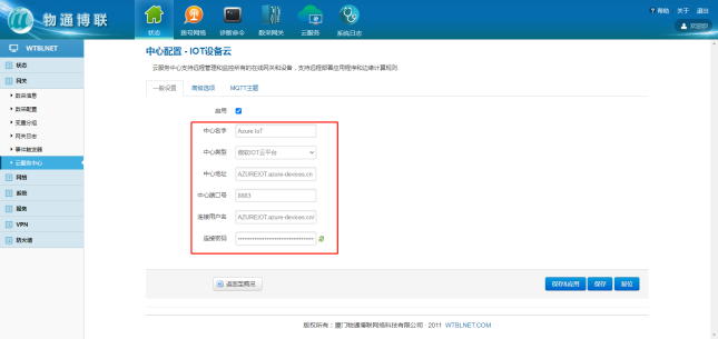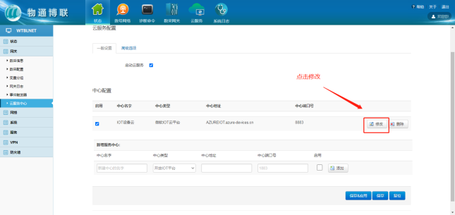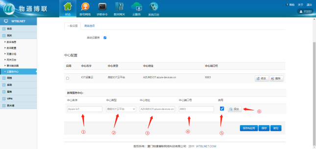 选择“微软云平台”,打开G22恒峰集团 G22网关WEB界面,新建一个连接中心,中心类型选择微软IoT云平台,输入相应信息,勾选启用,点击“添加”