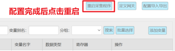 变量配置主要是定义变量名(自定义内容,不可使用中文命名)、变量别名(自定义,可使用中文名字)、寄存器类型和寄存器偏移地址,并定义一些数据规则(如:倍率、小数点、单位、告警)。