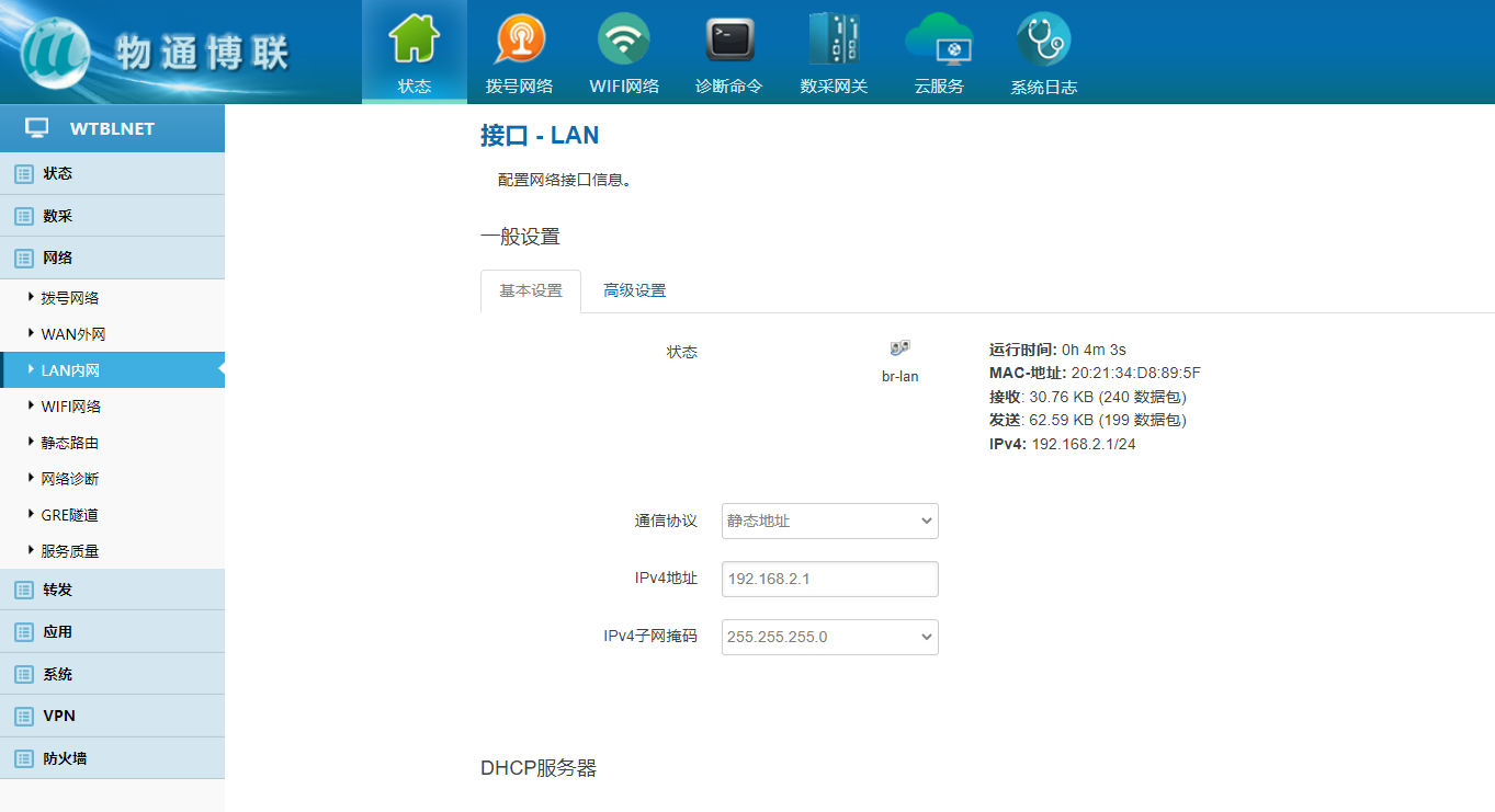 下载中心 视频中心 常见问题 售后服务 工业网关 设备快线 数据云平台 联网设备 问答百科 如何修改工业智能网关的LAN口IP地址? 时间:2022-10-26 09:06:09 点击:4728 关键词:工业智能网关,LAN口 问题:如何修改工业智能网关的LAN口IP地址? 回答: (1)电脑直连网关,确保电脑与网关处于同网段或者自动获取 浏览器里面输入192.168.2.1 (2)登陆网关配置界面 默认用户名/密码:admin/123456 (2)选择网络——Lan内网——更改IPV4地址、子网掩码,保存应用 (3)注意电脑本机IP地址是否与更改地址处于同网段(自动获取需重新拔 插网线) (4)浏览器输入更改后的IP地址登陆到网关配置界面即修改成功 上一篇:工业智能网关和DTU有什么区别吗? 下一篇: 工业智能网关需要另外配4G路由器吗?