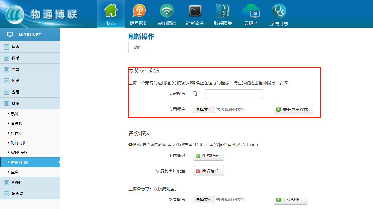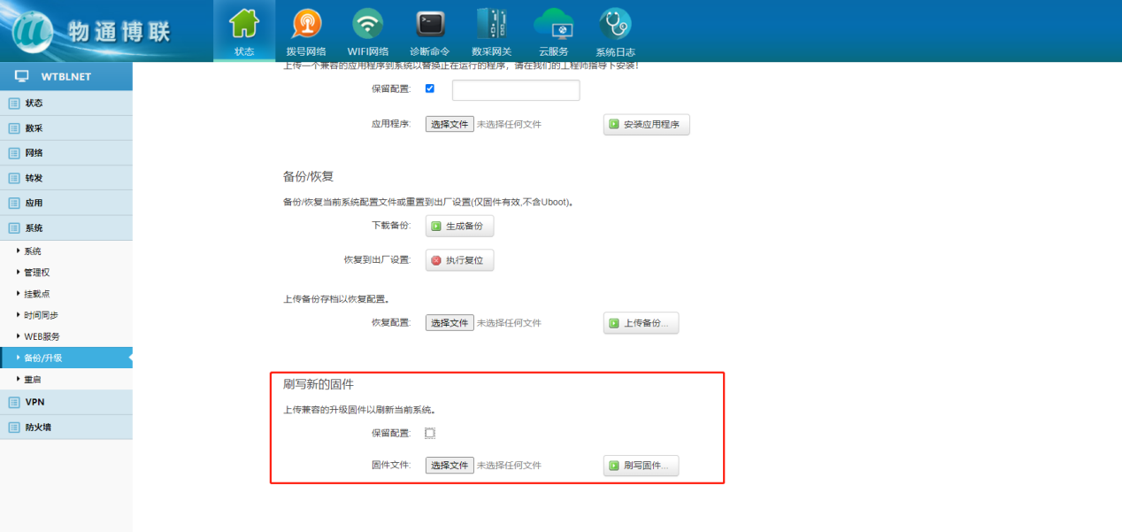 下载中心 视频中心 常见问题 售后服务 工业网关 设备快线 数据云平台 联网设备 问答百科 工业智能网关如何更新程序和固件? 时间:2022-10-26 09:39:53 点击:5072 关键词:工业智能网关,网关配置,固件升级 问题:工业智能网关如何更新程序和固件? 回答: (1)固件升级:后缀为。bin的文件 点击系统—备份/升级—选择文件—刷写程序(不保留配置) (2)IPK文件升级:后缀为。ipk的文件 点击系统—备份/升级—选择文件—输入密码—安装应用程序(不保留配置) 上一篇:工业智能网关时间如何进行同步? 下一篇: 工业智能网关如何连接wifi热点?
