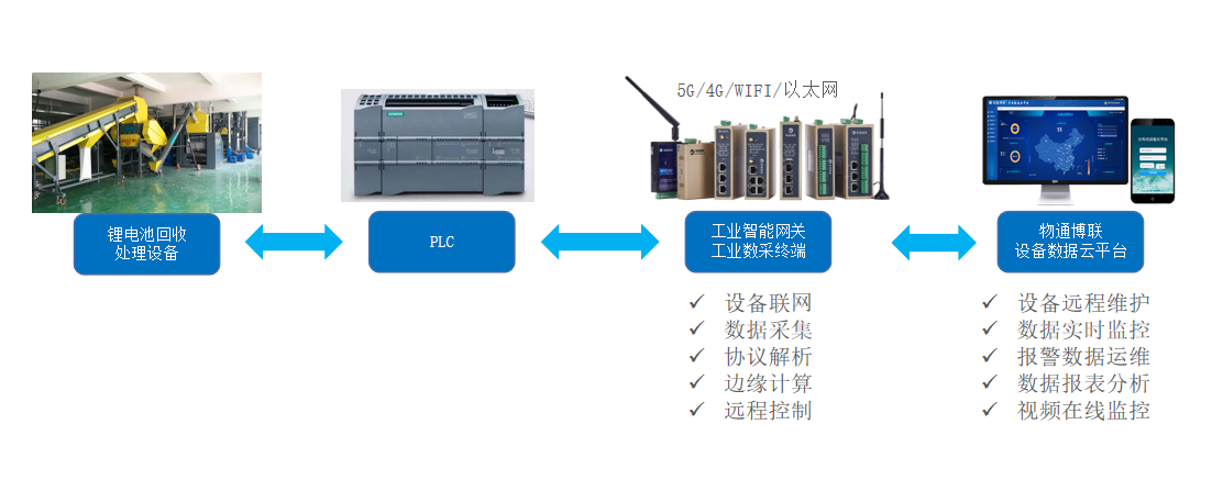 顺利获得将G22恒峰集团 G22边缘计算网关接入锂电池资源化回收处理设备的PLC、传感器等设备,可以进行数据采集和实时通信,从而实现远程监控、故障报警、运维管理、远程维护、数据分析等多种智能功能,能够帮助企业快速觉察设备故障并及时维护,确保生产安全与生产效率,促进持续性绿色生产。