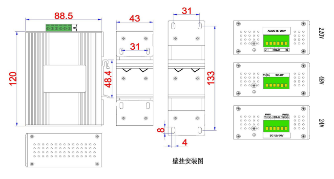 安装方式 DIN卡轨式或壁挂式