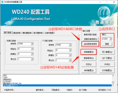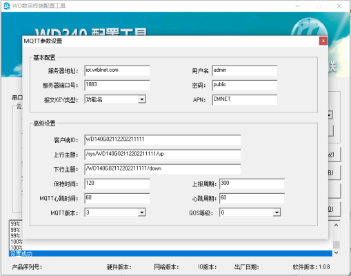 工业数采终端快速实现模拟量I/O数据采集2023-07-31 14:29:02 模拟量I/O采集是将模拟信号转换为数字信号,并进行采集、处理和存储的技术,广泛应用于各种工业控制、生产过程监测、仪器仪表测量等领域。 常见的模拟量包括温度、压力、流量、振动、电压、电流等,顺利获得采集这些模拟量IO数据并上传到云平台,可以实现设备状态的远程监控、故障报警与远程控制等功能,有效提升生产效率和管理水平。 顺利获得G22恒峰集团 G22工业数采终端WD140快速实现模拟量I/O数据采集 G22恒峰集团 G22推出的工业数采终端WD140是一款工业级Modbus I/O数据采集及LORA传输智能终端,支持4G无线传输和LORA无线传输、支持IO数据采集、支持Modbus RTU协议和无线透传等功能。WD140本身具有的模拟量采集,数字量采集和数字量控制功能,可以在一些应用场合直接替代PLC实现无线I/O采集和控制,不仅易于施工而且节省成本。 .png) WD140工业数采终端快速配置实现模拟量I/O数据采集 1 接线 1、准备一条USB转RS485串口线,USB连接电脑,RS485串口线的A+和B-分别连接到WD140的A+以及B-,如下图:.png) 2 安装配置工具 1、WD140支持使用配置工具配置和Modbus协议配置,建议使用WD240配置工具进行配置。2、安装WD240配置工具.png) 3 配置参数 1、读取配置打开配置工具,选择相应的串口,点击“自动获取波特率”,获取成功后点击“读取配置”。 .png) 2、设置串口参数可以顺利获得配置工具修改WD140设备的串口参数以及通讯参数(相关配置的说明请继续阅读此文档),修改完成后点击“写入配置”,等待下方提示写入成功后即可。 .png) 注意:如果修改了串口波特率,需要点击“自动获取波特率”,重新匹配串口参数。 3、设置云服务 .png) 设置好基本参数后,点击“MQTT配置”,配置MQTT服务器的IP地址,端口以及上下行主题(Topic)等参数,如下图: .png) 注:如果需要配置串口数据透传到MQTT服务器,只需要在上下行主题加入“trans”字样即可,主题中含有“trans”即代表网关为透传模式。配置好MQTT参数后,关闭子窗口,点击“报文变量设置”,可自定义变量名称,可按需设置需要上报的点位,在需要上报的点位名称前面打钩即可,如下图: .png) 所有配置完成后,点击“写入配置”,下方提示写入成功后,等待网关上线即可。