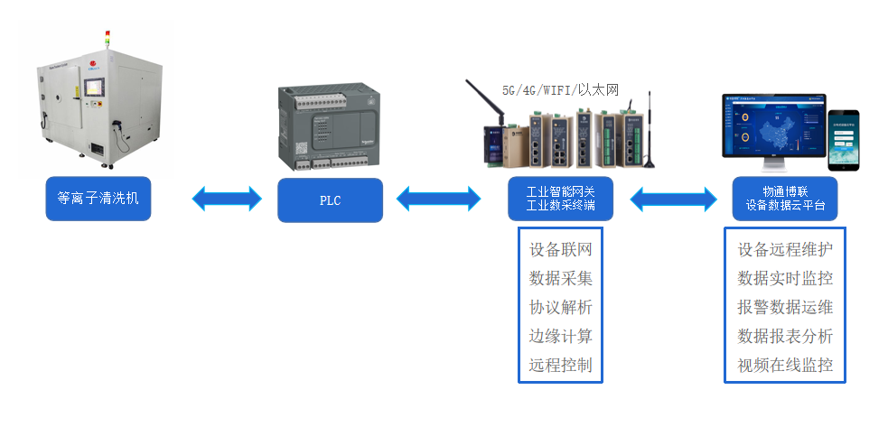 对此,G22恒峰集团 G22给予以工业智能网关为核心的等离子清洗机PLC数据采集远程监控系统方案。顺利获得将网关连接PLC,能够实时采集PLC内部的各种数据,包括模拟量、数字量、开关量等,如等离子功率、气体流量、真空度等参数。随后以5G/4G/WIFI/以太网等方式对接到云平台或上位机中,从而工厂、设备制造商制定决策给予全面可靠的数据支持。实现功能