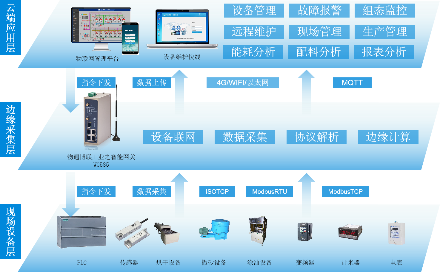 工厂现场具有PLC、温度传感器、压力传感器、烘干机、涂油机、撒沙设备、电表、计米器等设备,顺利获得串口、网口等设备接口将现场设备连接到G22恒峰集团 G22工业智能网关WG585,网关采集现场设备数据后顺利获得4G/WIFI/以太网等网络方式将数据顺利获得MQTT协议实时上传到物联网管理平台进行分析、处理,管理者顺利获得电脑和手机就能远程查看现场设备运行参数、设备状态、工艺组态、生产情况、物料消耗以及故障记录等,实现设备管理、现场管理、生产管理、远程维护、能耗分析、配料分析、数据分析应用等功能,实现产品生命周期和备品备件管理,保障高效率的生产。