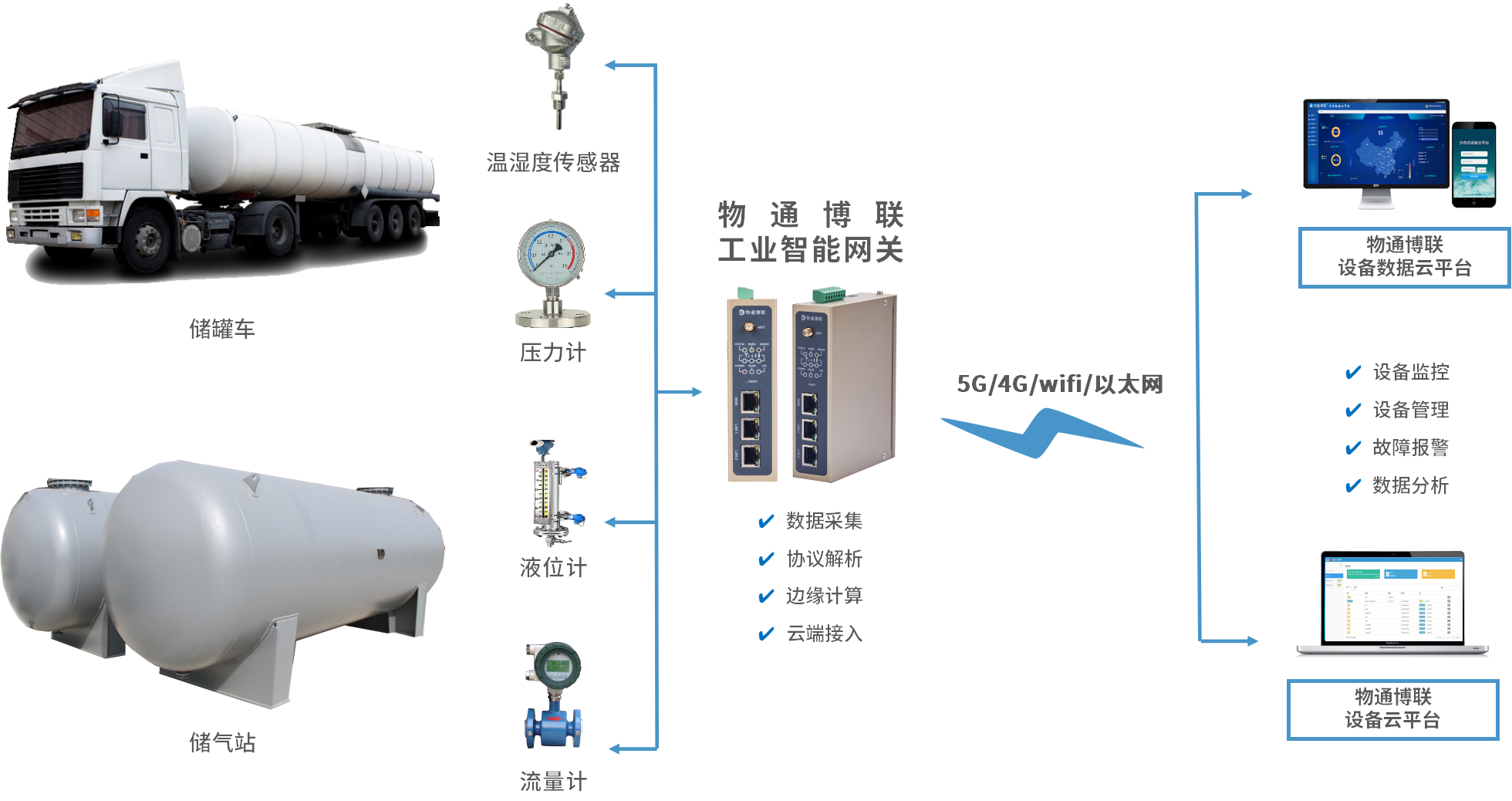 网关可以采集温度传感器、压力计、液位计、流量计等设备的数据,如液位、压力、温度、流量等数据,实现对槽罐车、储罐、储箱等设备的在线监测。
